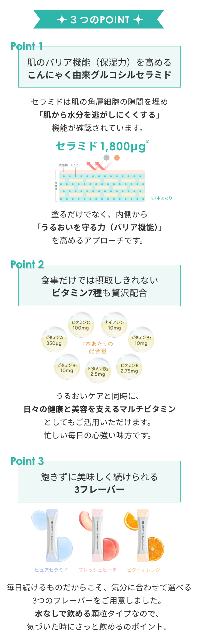 「@cosme+ The Basic Supplement」は、1日1本飲むだけの、顆粒タイプのサプリメントです。バリア機能をサポートするセラミドと、身体に嬉しいビタミンを贅沢配合しました。